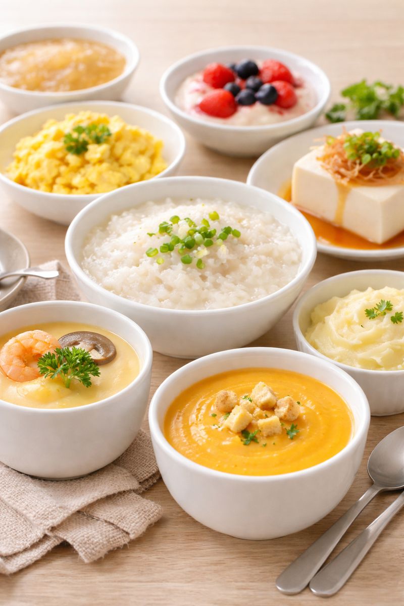 - 단백질: 계란찜, 두부, 흰살생선, 닭가슴살 등 부드러운 식재료